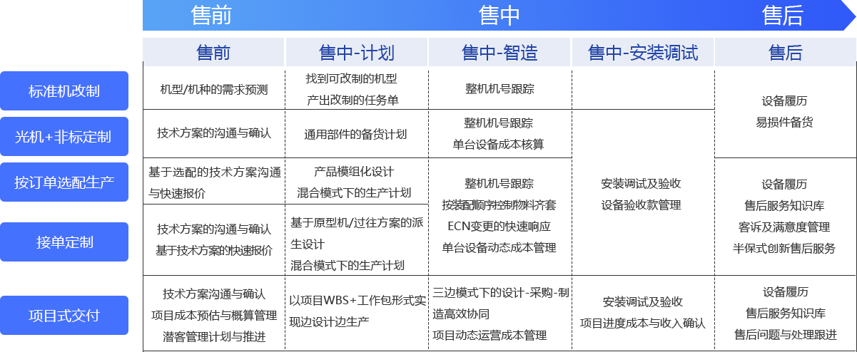 从销售、项目、设计、计划、供应链、生产、安装调试到售后服务,形成企业全流程、全价值链、全生命周期的数智化管理,用数智驱动的思维解决经营管理中的不确定性问题。